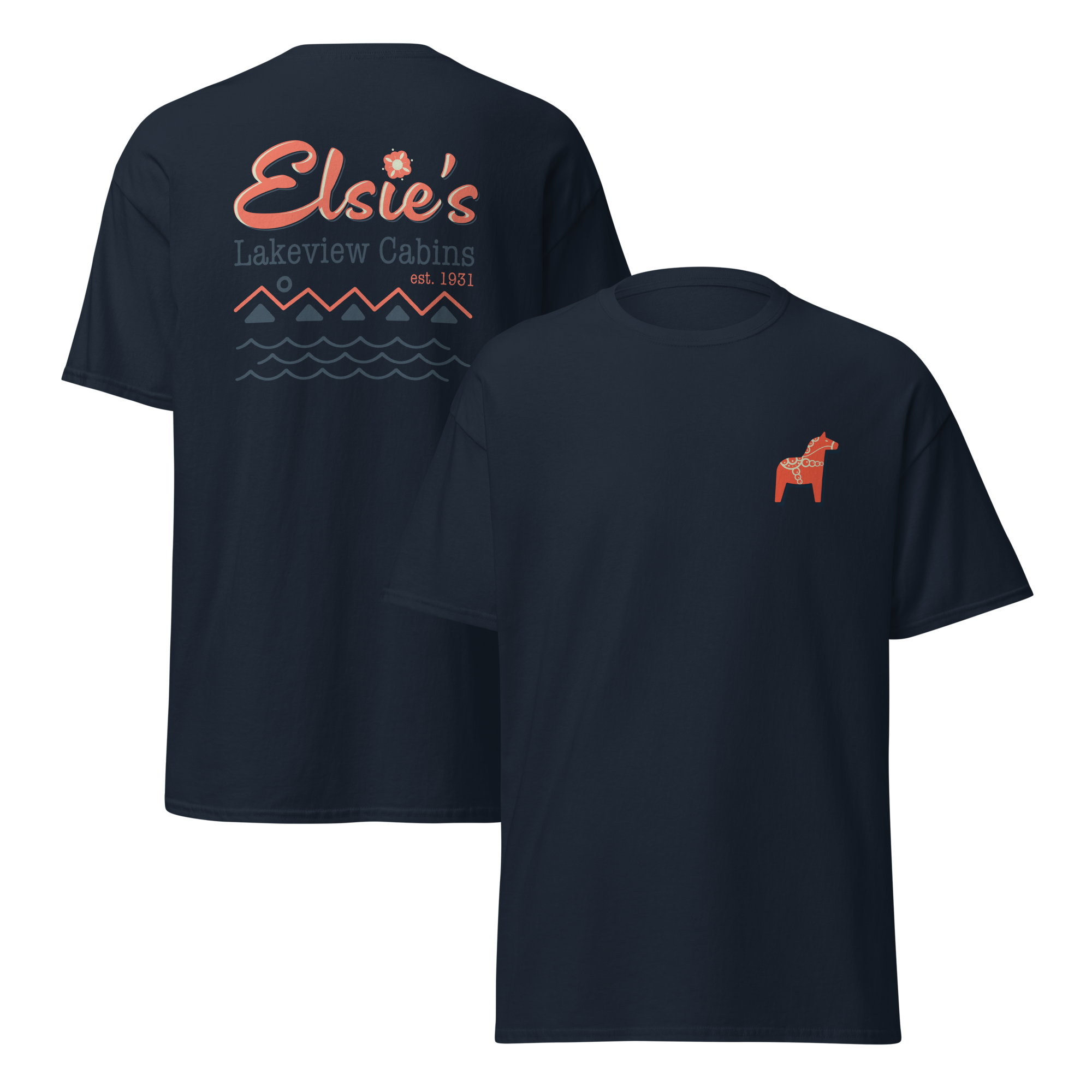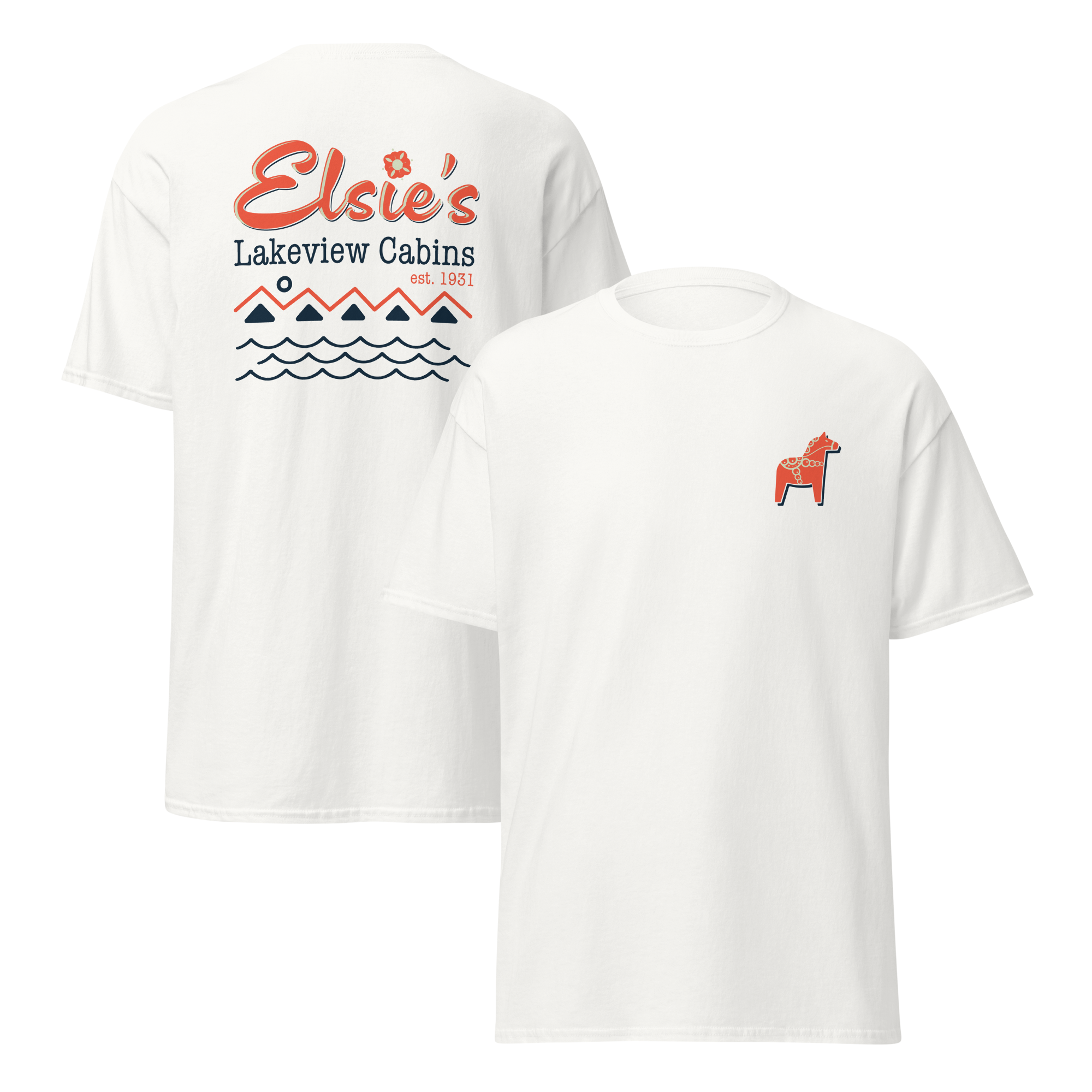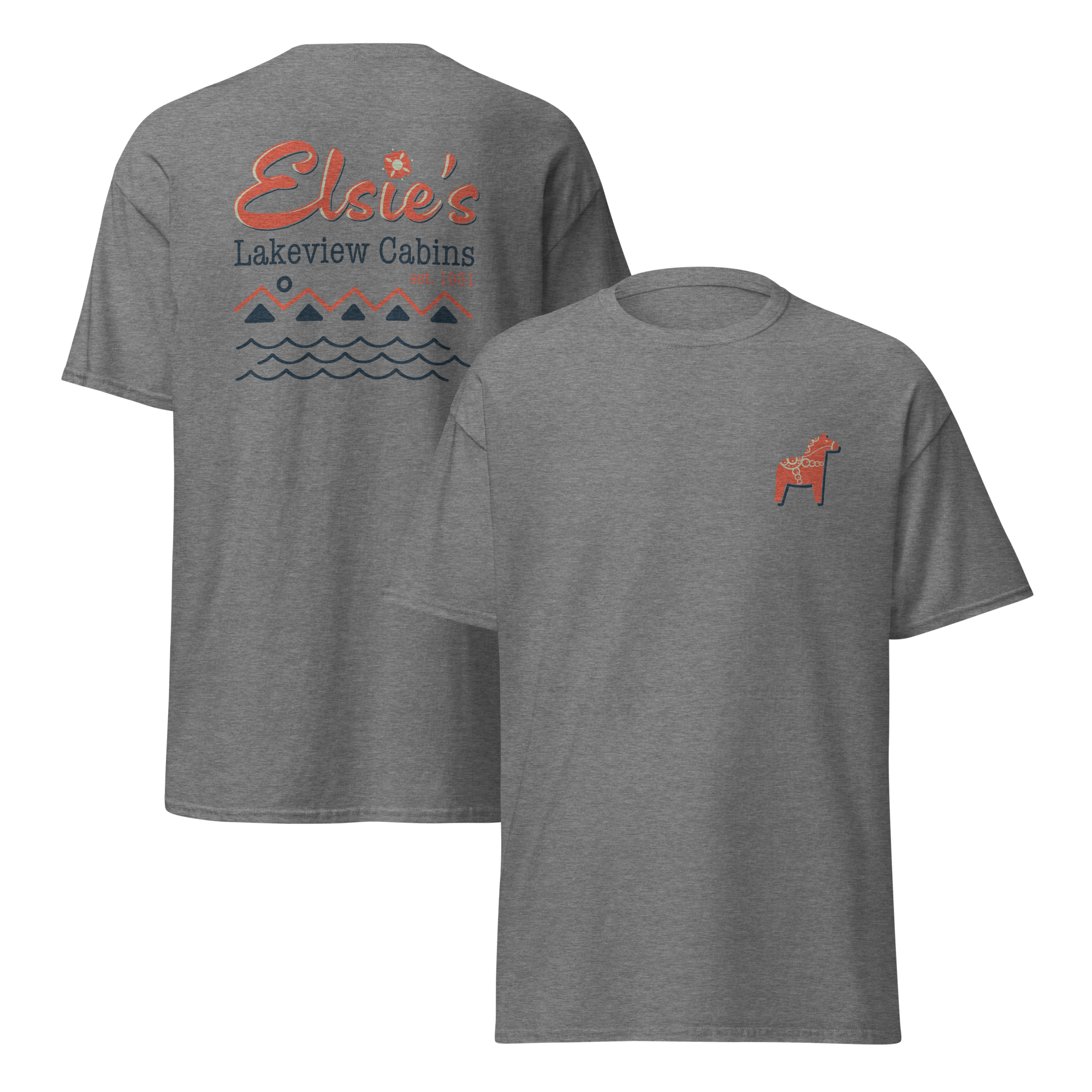 A little North Shore luck you can wear. This soft tee features a small Scandinavian Dala horse on the front, a traditional symbol of good fortune, with the Elsie’s Cabins mark on the back. Simple, timeless, and made for lake days, cabin nights, and remembering your stay at Elsie’s.